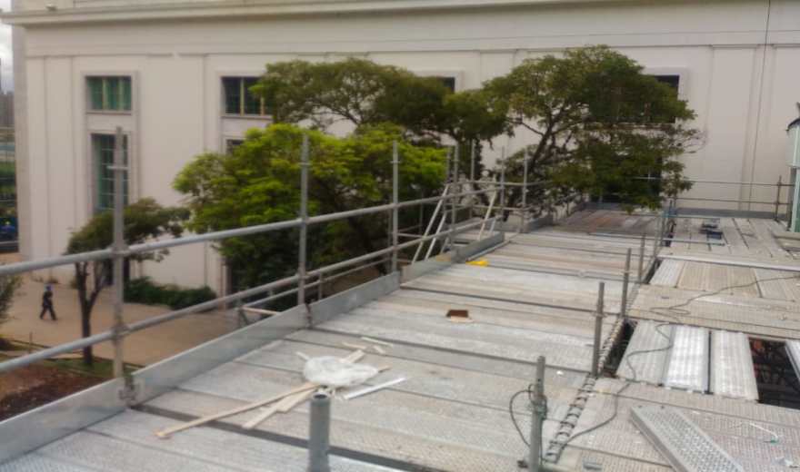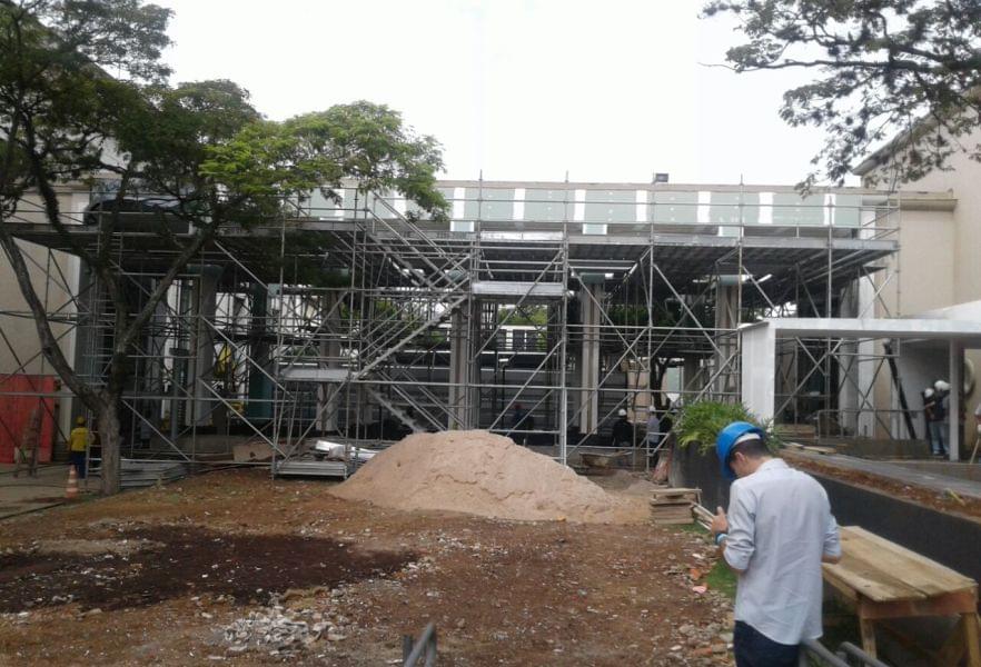 Devido a sua versatilidade, o Andaime Multidirecional está montado em diversos formatos, níveis e direções. Com plataforma de trabalho modulável, o equipamento possibilita vencer locais complexos nas obras da CASACOR São Paulo 2018.
