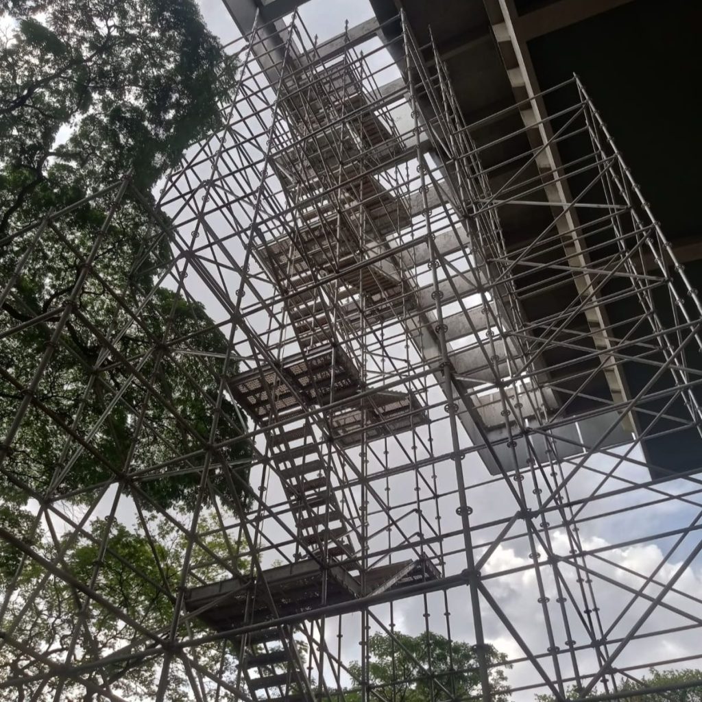 A Locação de Andaime Multidirecional é indicada para locais onde os andaimes convencionais não conseguem atender às necessidades do projeto. Esse sistema permite montagem em diferentes ângulos e formatos, adaptando-se facilmente a escadas, passarelas, fachadas, tanques industriais e áreas com múltiplas interferências.